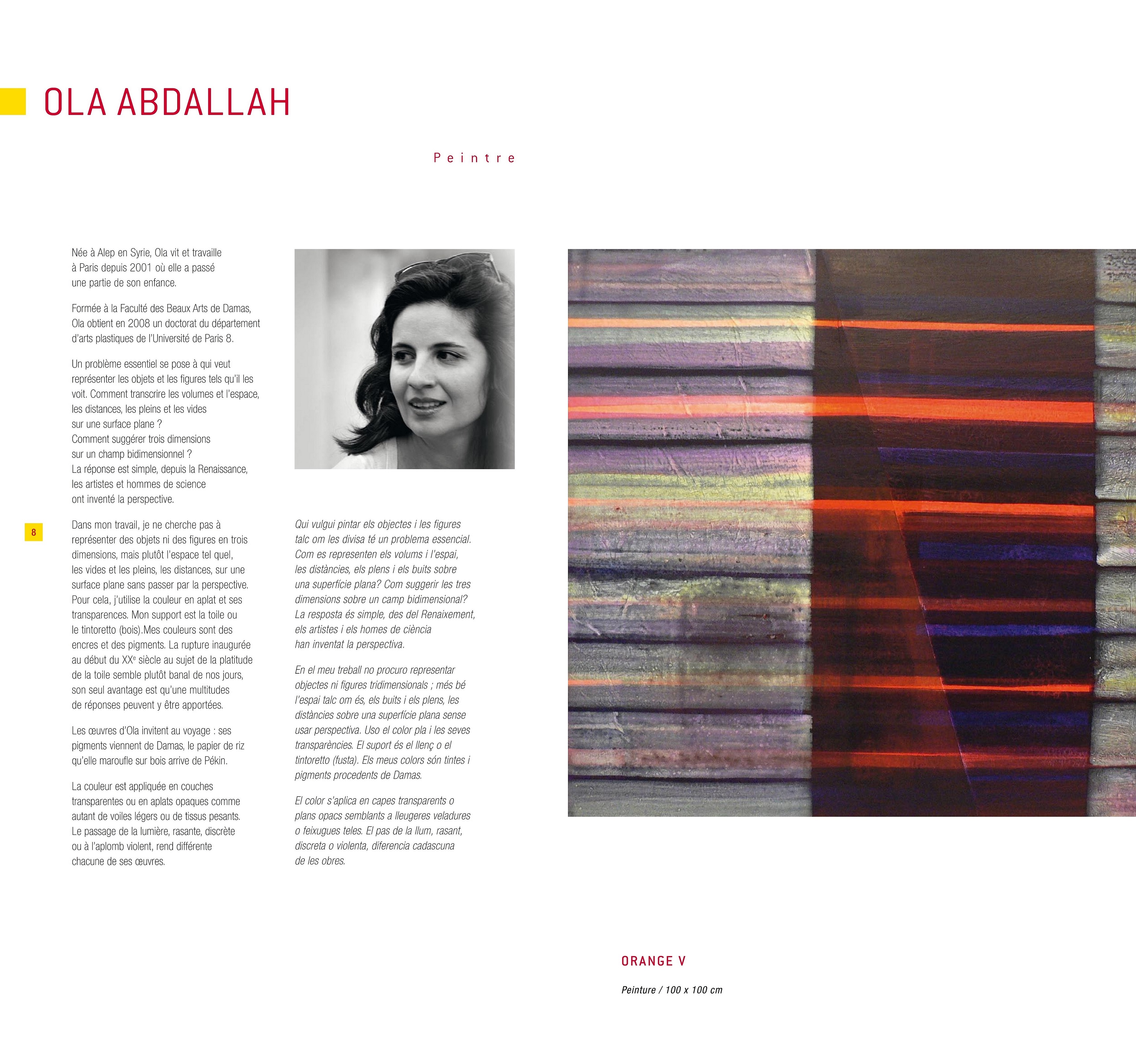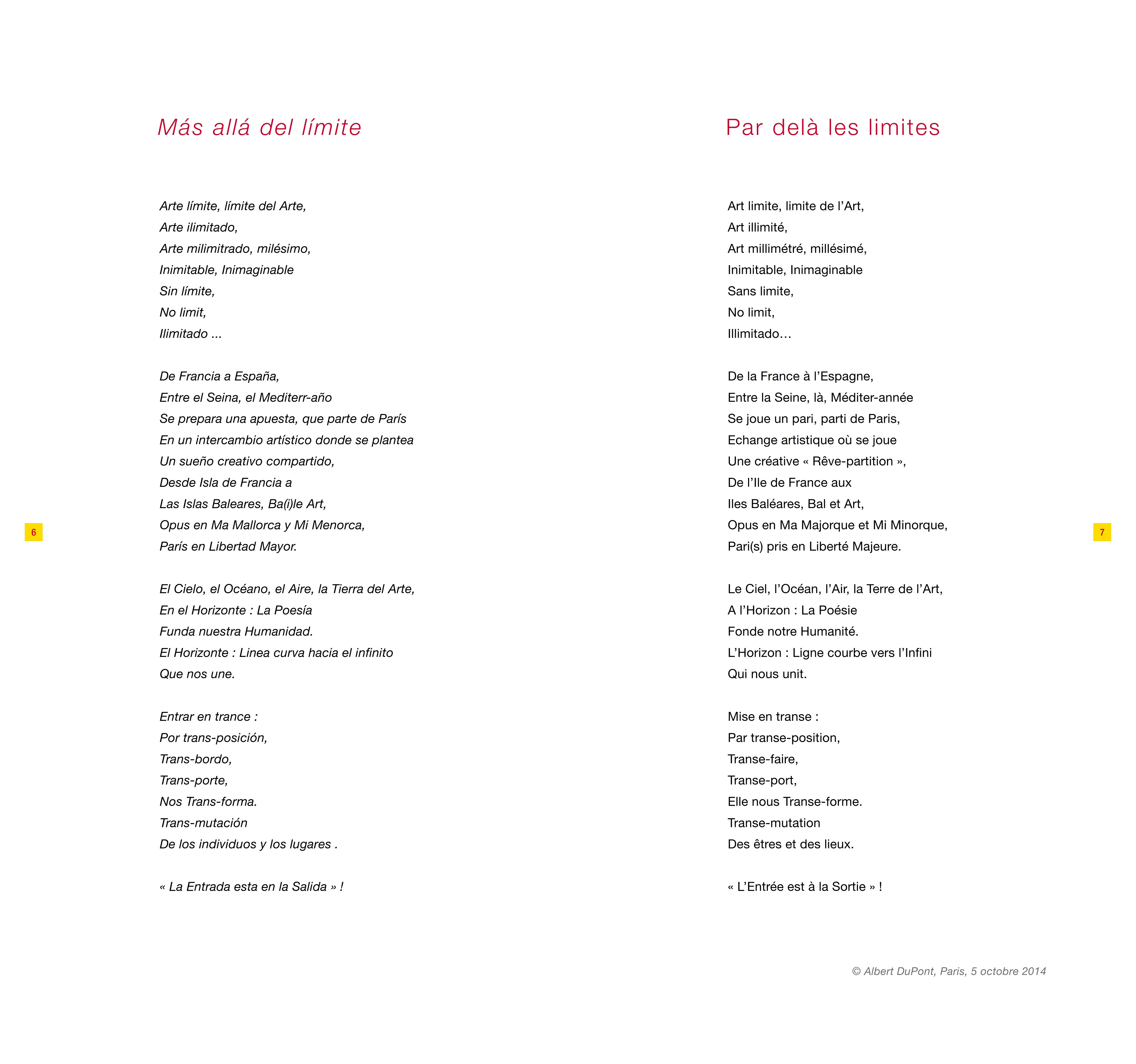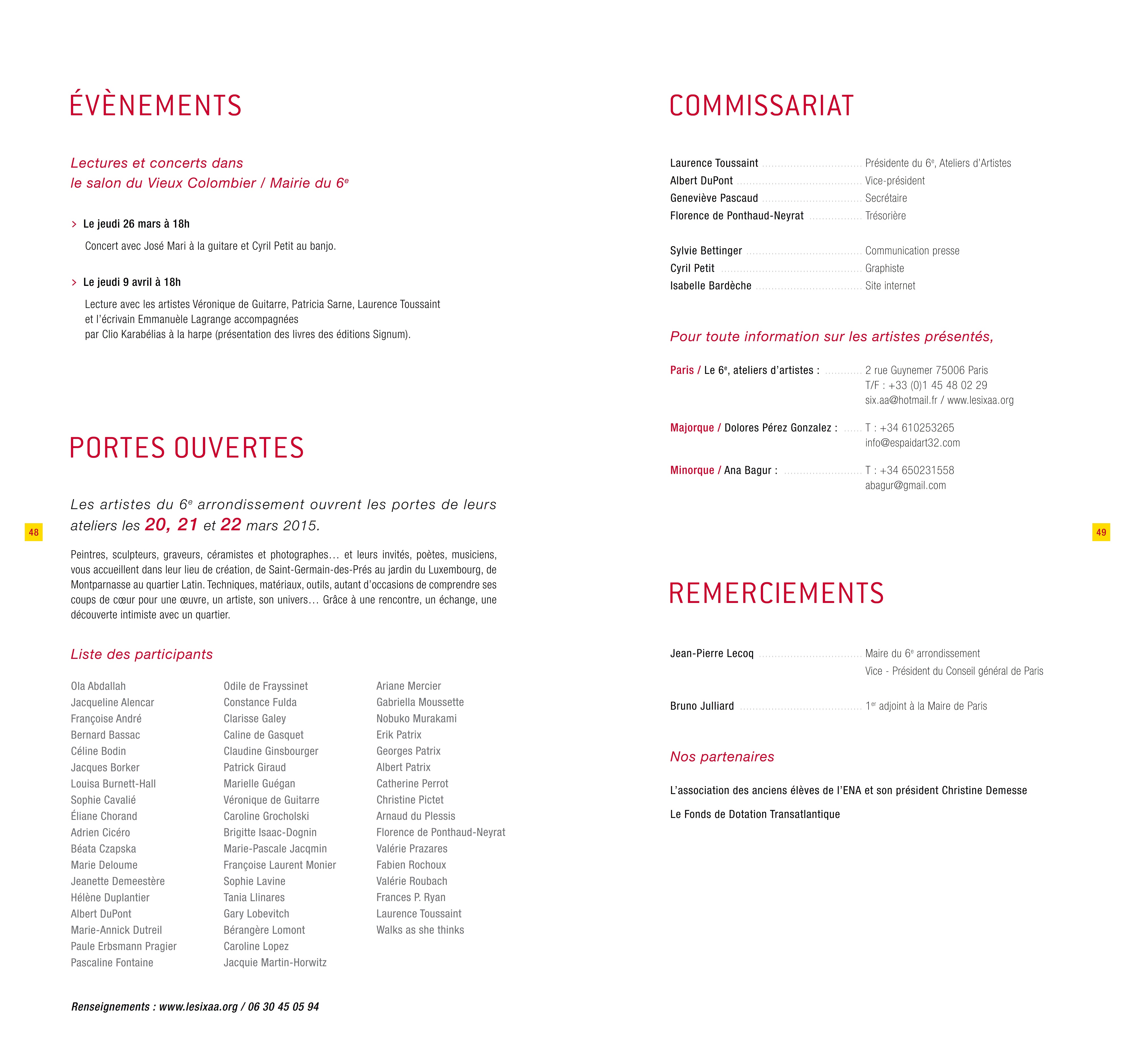 Als murs de l’Ajuntament del districte 6è, pintors, escultors, fotògrafs, gravadors sense límit, escruten, observen i veuen, a la seva manera, aquesta invitació de viatge del Sena a les Illes Balears, ressonàncies transmediterrànies... Manifestacions primaverals al districte 6è de Parìs dels 18 de març al 9 d’abril 2015 Lectures i presentacions de llibres d’artistes el dijous 25 març i 9 d’abril Portes Obertes dels Tallers d’Artistes del Districte 6è de París Aquests esdeveniments organitzats per Le 6e Ateliers d’Artistes s’inscriuen en el programa de la 17 edició Printemps des Poètes. Le 6è Ateliers d’Artistes es va crear l’any 1993 per promoure l’art contemporani en tota la seva diversitat. És, des de fa més de 22 anys, és el viver que ha permès acompanyar més de 180 artistes. Intercanvis artístics entre autors de França i de les Balears: Del 9 de maig a l27 juny. Exposició completa a Menorca: Sala Municipal del Roser, Ciutadella. Del 6 de juliol al 1 d’agost Ola Abdallah - Louisa